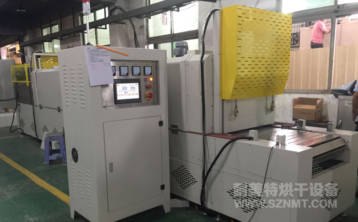 烘干部分總長4800mm,前后配自動提升門,緩沖區(qū)兩端各長300mm,冷卻區(qū)長1200mm, 進(jìn)料部分長600mm,出料部分升降接駁臺長700mm ;